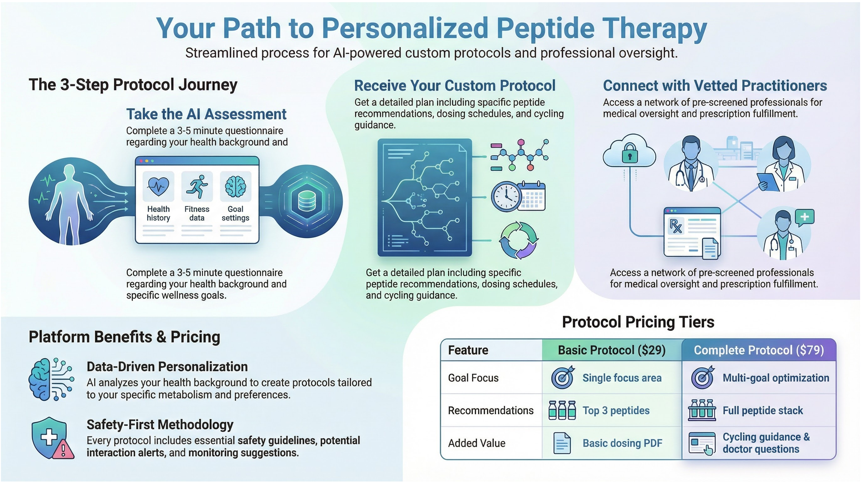 Get a Personalized Protocol — The AI engine analyzes quiz responses to produce a detailed protocol that includes specific peptide recommendations, dosing guidance, cycling schedules, safety considerations, expected timelines, lifestyle optimization tips, and a list of questions to bring to a medical consultation.